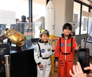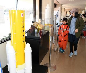 - ◎宇宙服着て飛行士気分 お絵描き、模型展示、トーク… 展示や体験多彩に会場では宇宙に関連した多彩な催しが開かれた。 お絵描きロケットのコ …